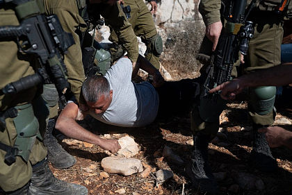 Des soldats israéliens rouent de coups et arrêtent un militant palestinien pendant la récolte des olives